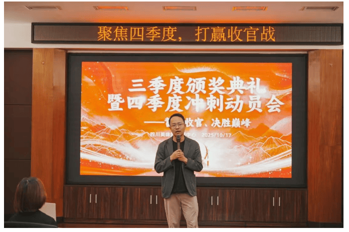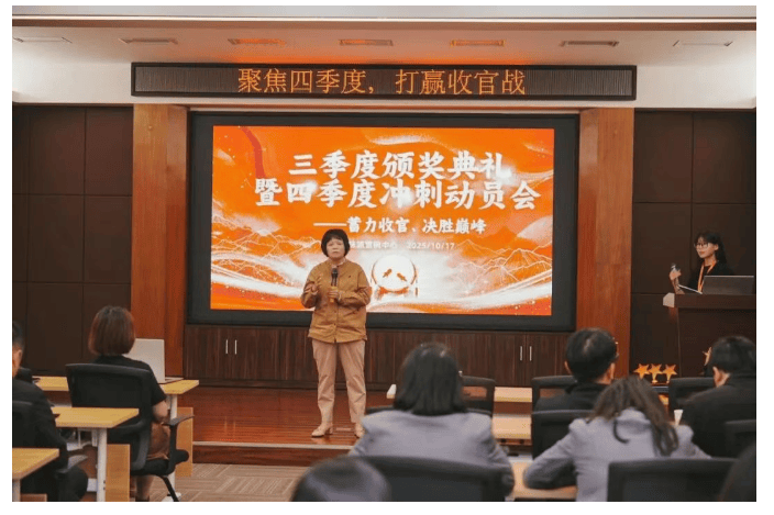 Q4冲刺动员大会暨三季度颁奖仪式作为本次系列会议的压轴环节,诚挚邀请到杨董事长、廖总、熊经理、王经理及营销中心全员参与。公司对三季度表现突出的优秀团队与个人进行隆重颁奖,激励全员以优秀为标杆,主动对标提升,营造比学赶超的良好氛围。