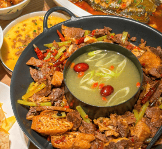 除了风味创新,“一锅两吃”的模式升级,更是干锅提升竞争力的关键。将传统干锅与汤锅结合,先让食客品尝干锅的干香浓郁,再尝汤的鲜美,实现“干香+鲜汤”的双重体验。这种模式的优势显而易见:对消费者而言,花一份钱就能享受两种吃法,性价比大幅提升;对门店来说,无需增加过多食材成本,仅通过调料搭配,就能丰富菜品形态,既区别于传统干锅,又不同于火锅,形成独特记忆点。