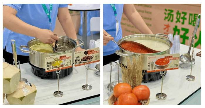 四川美味源展位前金黄透亮的椰香鸡汤,引来东南亚餐饮老板的密切关注与驻足品鉴。这款椰香鸡汤以我佳鸡汤为基底,融入马来西亚本土椰汁,经过 3 次口味迭代,巧妙平衡中国鸡汤的醇厚与东南亚椰香的清爽。