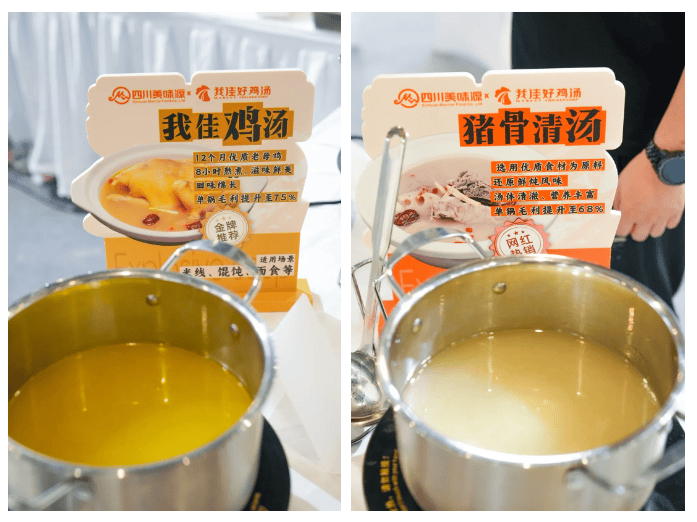汤料作为四川美味源的明星产品,此次展会鸡汤同样大放异彩。我佳鸡汤用365天散养老母鸡,13道工艺慢炖8小时,完全替代传统手工熬汤,汤汁清亮无渣,鲜醇度比同类竞品高约30%。